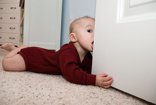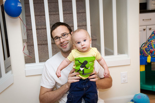 We ran out of candy just in time for Avery’s bedtime routine. He spent his first Halloween passing out candy with Mommy and Daddy. Commodus stayed upstairs behind the recently installed baby/pug gate, barking every time the doorbell rang. Between trick-or-treaters, we played on the floor with Avery. He’s scooting around pretty quickly these days. He gets up on his hands and knees, but his knees slip out from under him when he starts moving.
